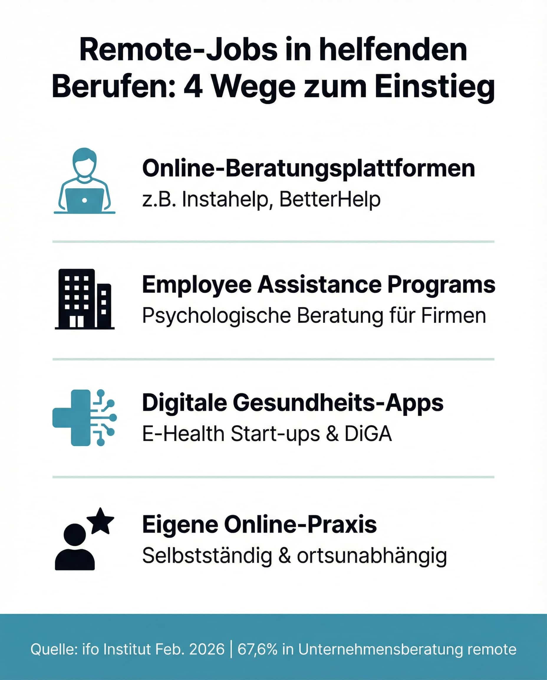 Immer mehr Unternehmen, Kliniken und spezialisierte Plattformen bieten Festanstellungen an, die zu 100 Prozent remote ausgeübt werden können. Dazu gehören vor allem drei Bereiche: Online-Beratungsplattformen wie Instahelp oder BetterHelp, die regelmäßig psychologische Beraterinnen und Therapeuten für die digitale Beratung suchen; Employee Assistance Programs (EAP), bei denen große Firmen die psychologische Betreuung ihrer Mitarbeiter an externe Dienstleister auslagern, die diese Beratung telefonisch oder per Video anbieten; sowie Digitale Gesundheitsanwendungen (DiGA), bei denen Start-ups im Bereich E-Health Fachkräfte für die fachliche Begleitung ihrer digitalen Programme suchen. Der Vorteil einer Festanstellung liegt in der finanziellen Sicherheit und den geregelten Arbeitszeiten. Allerdings bist du weiterhin in die Strukturen eines Arbeitgebers eingebunden.